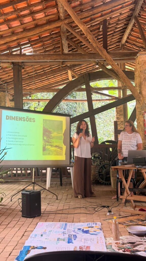 • Participação nas apresentações sobre a construção da Matriz da Sociobiodiversidade, partilhando metodologias, experiências territoriais e resultados obtidos no trabalho de campo desenvolvido pelo CFE-UC. Um momento essencial para afinar entendimentos e fortalecer a construção coletiva desta ferramenta estratégica para a Rede.